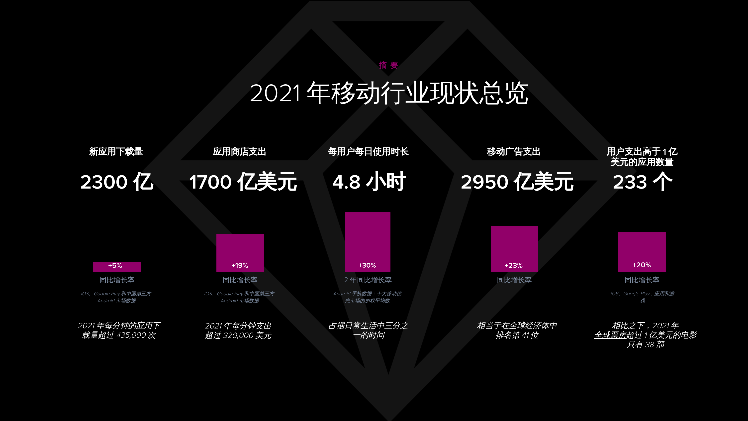 ?近日,全球領(lǐng)先的移動數(shù)據(jù)和分析公司App Annie發(fā)布了《2022年移動市場報告》。報告總結(jié)了2021年全球移動領(lǐng)域的突破性轉(zhuǎn)變,全球應(yīng)用下載量、應(yīng)用商店用戶支出、廣告支出等多個指標保持了良好增幅。其中每用戶日均使用時長為4.8小時,與 2019 年相比上升30%;盡管IDFA 新政于2021年上半年落地,全球移動廣告支出在2021年依然保持快速增長態(tài)勢,達到2950億美元,同比增長了23%。App Annie表示,移動領(lǐng)域已成為吸引消費者的主要渠道——在數(shù)字支出中占據(jù) 70%,伴隨 2022 年北京冬奧會和美國中期選舉的到來,數(shù)字廣告支出將實現(xiàn)強勁增長,預(yù)計到2022年,移動廣告支出將增長至3500億美元。